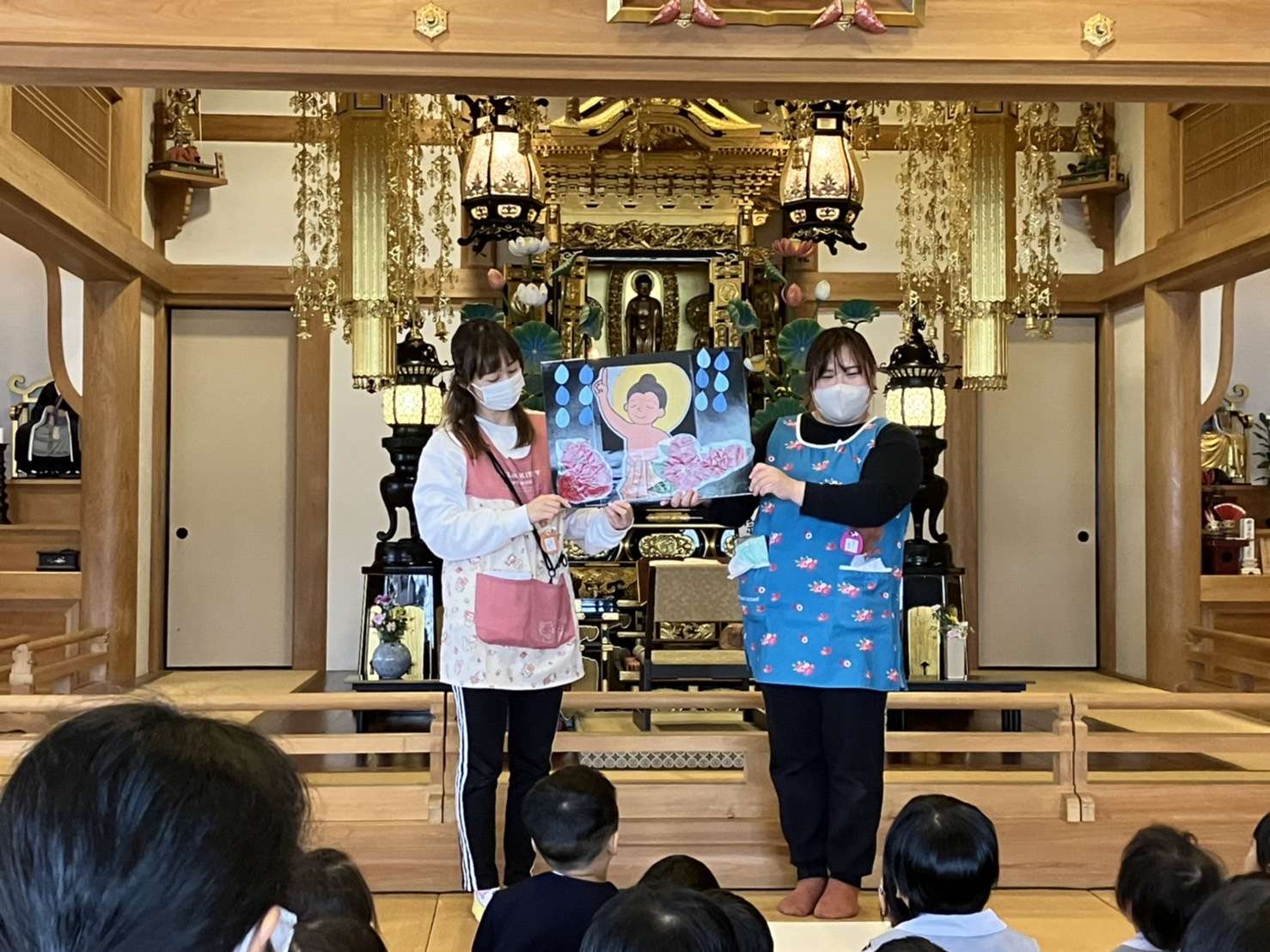 本堂では全園児が集まって、仏様の誕生についての紙芝居を見ました。