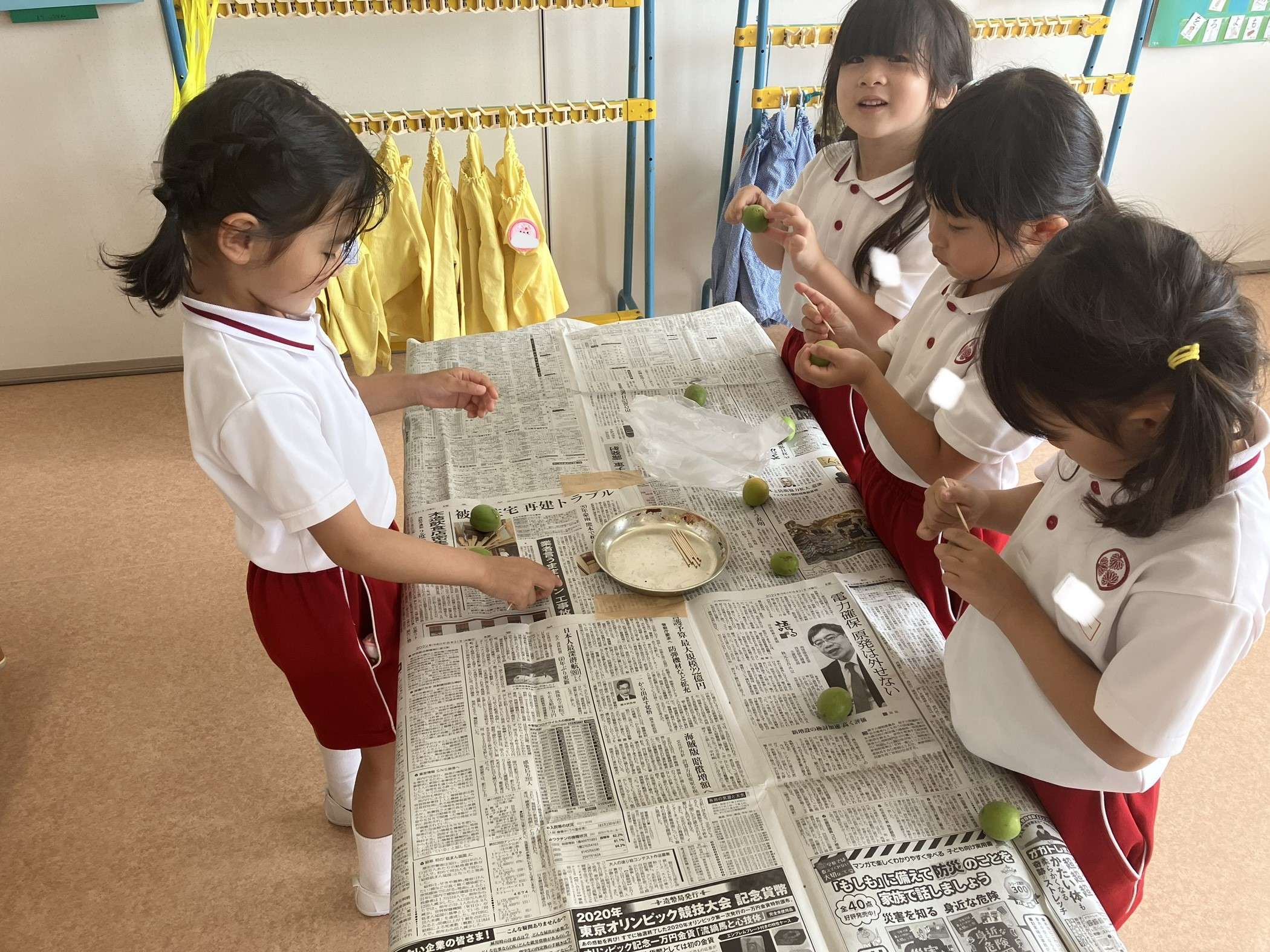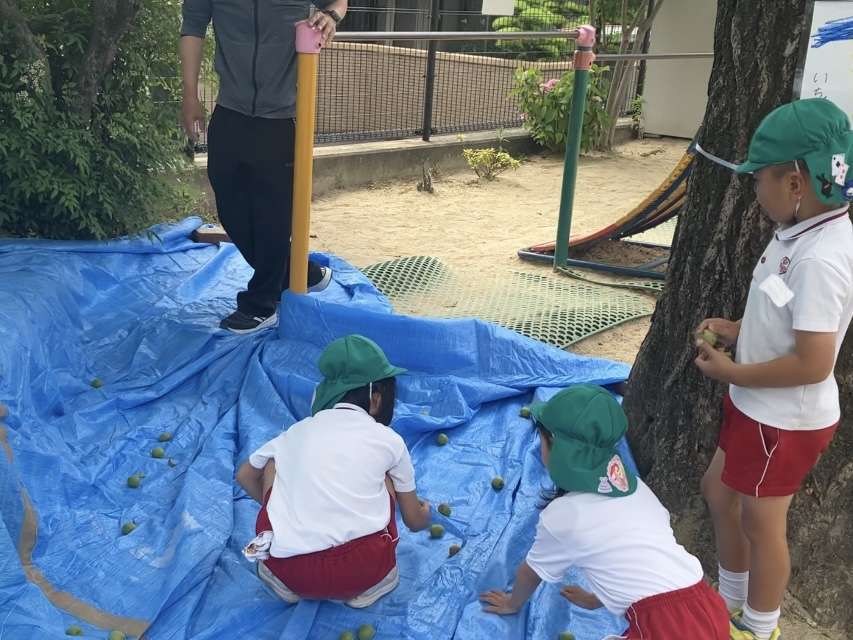 幼稚園にある梅の木を揺らして梅を収穫しました。