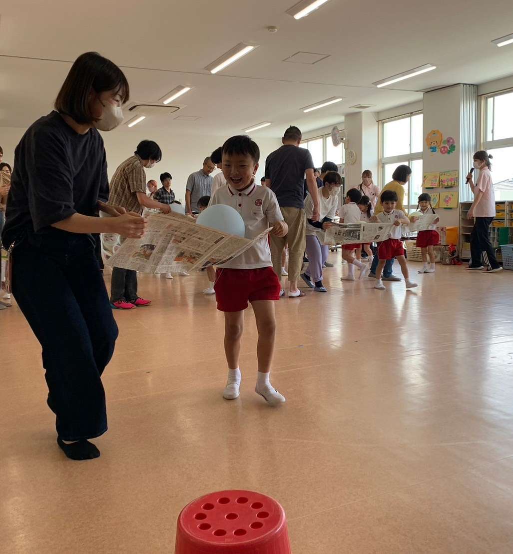 新聞紙を広げて風船運びリレー!年長組さんもとっても盛り上がりました!