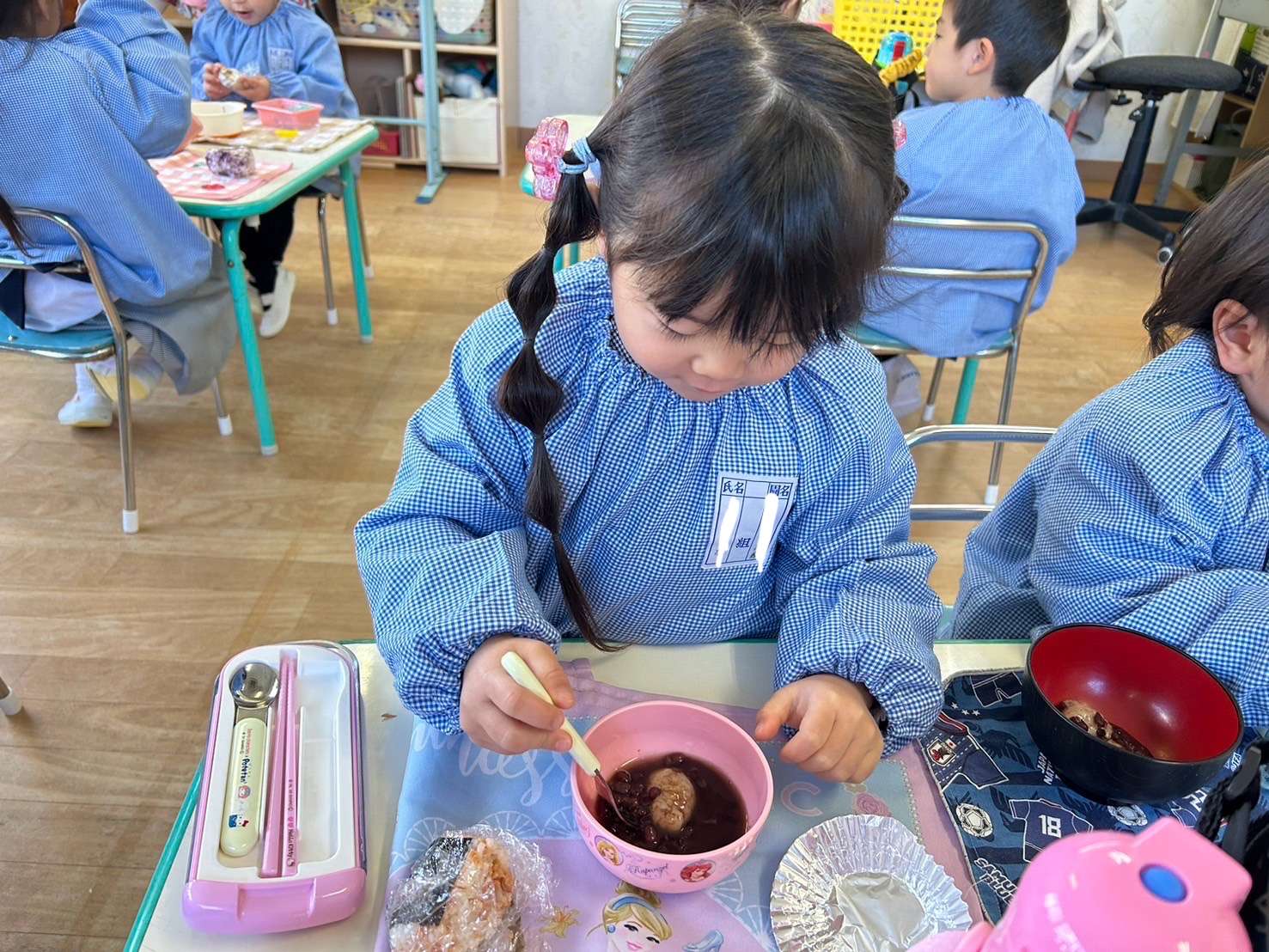 そして待ちに待った給食の時間!ぜんざいの入った大きな鍋が届くと「いい匂い~♡」と大喜び!びよーんと伸びる柔らかいお餅を食べて「美味しい~」と笑顔いっぱいです☆