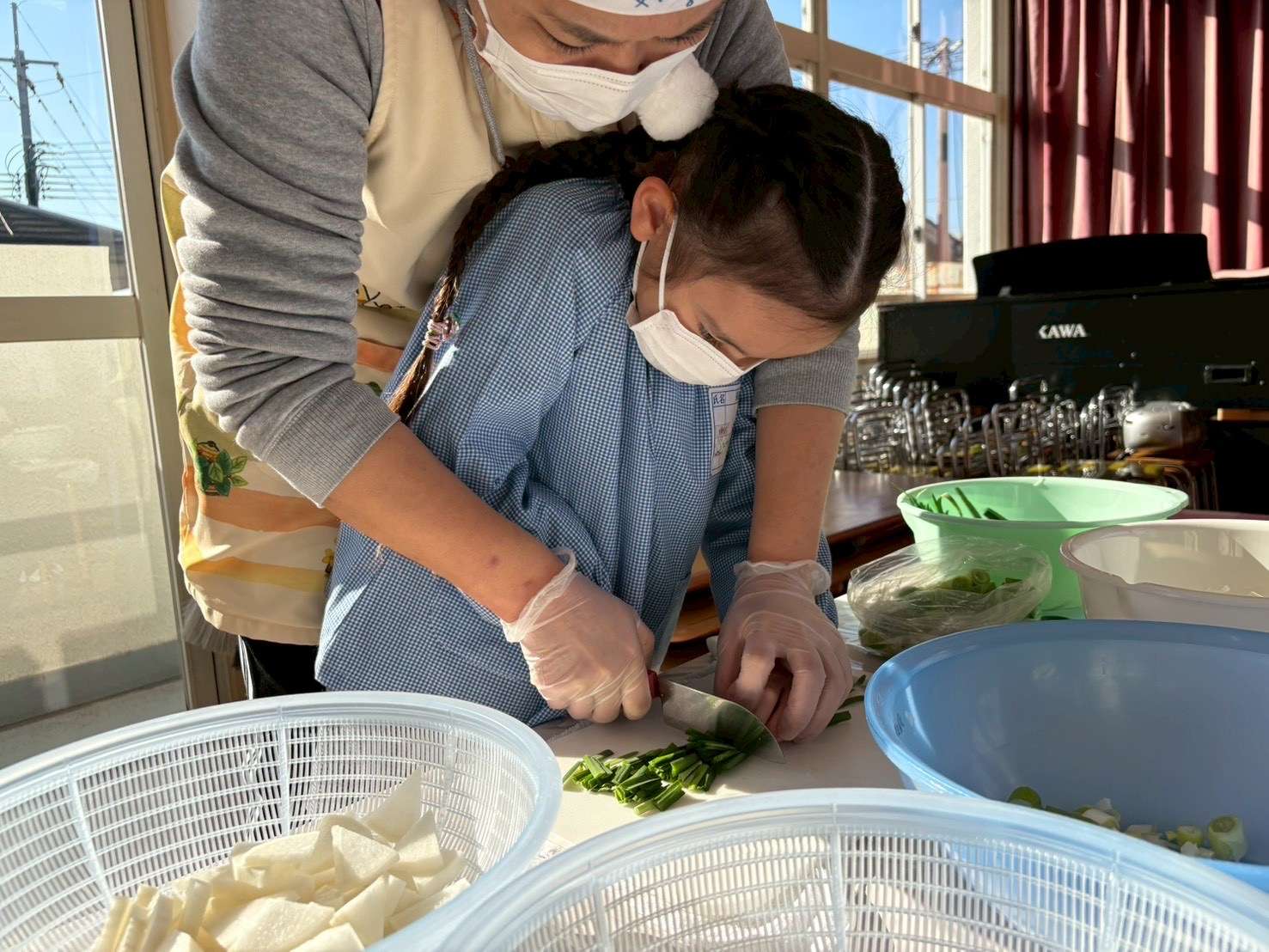 それぞれの学年で食材をちぎったり、包丁で切ったりしました。子ども達が切った食材は、職員室に持っていき、調理をしてもらいます。
