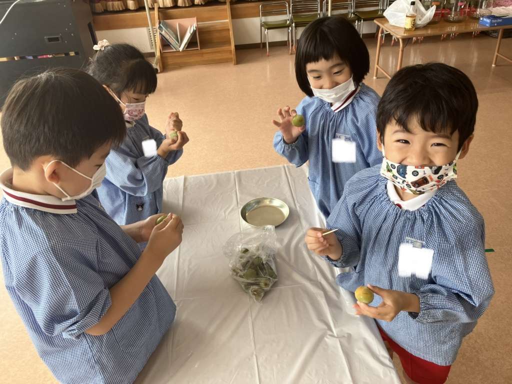 幼稚園にある梅の木を揺らして梅を収穫しました。 収穫を始めると、「いい匂いがす... -